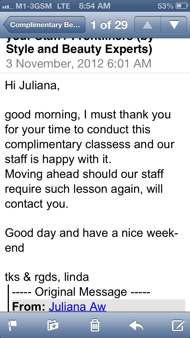 Call Juliana at 96881798 or email: juliana@styleandbeautyexperts.com to book appointment. Min. of 4 pax we could start a class.